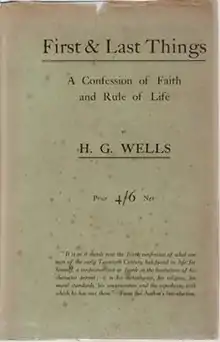 First and Last Things is a 1908 work of philosophy by H. G. Wells setting forth his beliefs in four "books" entitled "Metaphysics," "Of Belief," "Of General Conduct," and "Some Personal Things." Parts of the book were published in the Independent Magazine in July and August 1908.[1] Wells revised the book extensively in 1917, in response to his religious conversion, but later published a further revision in 1929 that restored much of the book to its earlier form. Its main intellectual influences are Darwinism and certain German thinkers Wells had read, such as August Weismann.[2] The pragmatism of William James, who had become a friend of Wells, was also an influence.[3]