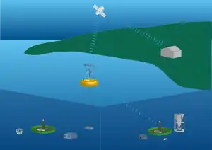 Fixed-point ocean observatories are typically composed of a cable anchored to the sea floor to which several automatic sensors and samplers are attached. The cable ends with a buoy at the ocean surface that may have some more sensors attached.[1] Most observatories have communicating buoys that transmit data to shore, and which allow changes to the acquisition method of the sensors, as required.