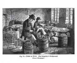 In times of war, millions of gun flints were needed and in the United Kingdom, mining flint and then knapping it became a substantial cottage industry around Brandon, Suffolk, an area that previously saw large scale flint mining in the Neolithic area.[9] In 1804, Brandon was supplying over 400,000 flints a month to the British military.[7] However flint knappers suffered from silicosis, known as Knappers Rot due to the inhalation of flint dust.[10] It has been claimed this was responsible for the early death of three-quarters of Brandon gun flint makers.[11]