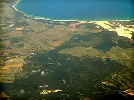 ![]() Aerial view, with the Ringarooma River floodplain on the upper right | |