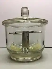 The material under test is suspended inside a container over a source of powdered sulfur. The powdered sulfur is placed in a dish. The temperature and internal humidity of the container are regulated. Temperature is typically controlled by placing the container in a constant temperature oven. Humidity inside the container is typically controlled with a saturated salt solution whose vapor pressure is well characterized at the temperature of the test.[8] Saturated potassium nitrate solution is standard practice for humidity control in humid sulfur vapor testing. The saturated salt solution is placed physically outside of the sulfur containing dish. The sulfur containing dish may “float” in the saturated salt solution. The dish should provide an ample, available powdered sulfur surface.