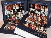 For Your Consideration is a heading frequently used in advertisements in entertainment trade publications such as Variety, Backstage, and The Hollywood Reporter, as well as outdoor advertising, direct mailers, and events in Los Angeles.[1] They are specifically directed towards members of awards voting groups in the entertainment industry, like the Academy of Motion Picture Arts and Sciences that annually presents the Academy Awards celebrating the best in motion pictures, or the Academy of Television Arts & Sciences which presents the Primetime Emmy Awards for television.