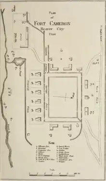 The fort was established on May 25, 1872 by the 8th Infantry, commanded by Major John D. Wilkins.[3] Located on the north side of the Beaver River, many of the buildings were constructed with a distinctive black rock sourced from the nearby mountains. The new fort included four company barracks, a guardhouse, commissary, hospital, and officers’ quarters.[4] Originally called the Post of Beaver, it was renamed Fort Cameron on July 1, 1874 in honor of Colonel James Cameron, who was killed at the First Battle of Bull Run in 1861.[3]