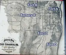 Fort D is the only surviving fortification built by Union troops in the area during the Civil War. Fort A was located slightly north of downtown Cape Girardeau on a high hill. A grist-grinding windmill was included in the fort. Fort B was located where Academic Hall now stands at Southeast Missouri State University. Fort C was built at the end of Bloomfield Road east of Pacific St. Smaller earthworks included Battery A at the corner of Henderson and New Madrid Streets, Battery B on Whitener Street just east of Sunset Avenue and rifle pits along Perry Avenue and on the hill where Southeast Missouri Hospital now stands.[5]
