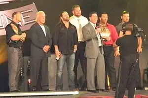On the August 12 episode of Impact!, TNA X Division Champion Douglas Williams, who had helped Flair defeat his nemesis Jay Lethal in a Street Fight the previous week, and Matt Morgan were added to Fourtune, as the stable attacked Extreme, Version 2.0 (EV 2.0), a stable consisting of former Extreme Championship Wrestling performers.[18][19] Fourtune had hoped to drive the ECW originals, whom they considered outsiders in their company, out of TNA, but the following week TNA president Dixie Carter sided with EV 2.0 and signed each of its members to contracts so they could settle their score with Fourtune.[20] In the first official matches between the two feuding factions, Styles defeated EV 2.0 leader Tommy Dreamer in a singles match, while Beer Money, Inc. squashed The Full Blooded Italians (Guido Maritato and Tony Luke) in a tag team match.[20][21] At No Surrender, Fourtune defeated EV 2.0 in both of the matches between the two factions, when Douglas Williams retained his X Division Championship against Sabu and A.J. Styles defeated EV 2.0 leader Tommy Dreamer in an "I Quit" match.[22] On September 6, at the tapings of the September 16 episode of Impact!, Williams lost the X Division Championship to Jay Lethal.[23][24] Later that same night, Tommy Dreamer appeared on the Impact! Zone without his EV 2.0 partners, admitted his defeat and attempted to reach a truce with Fourtune, but was beaten down.[24] The following week, he returned with Raven, Stevie Richards, Sabu and Rhino and announced that Dixie Carter had given the five of them a Lethal Lockdown match against Fourtune at Bound for Glory. Later that same night, A.J. Styles defeated Sabu in a ladder match contested for the advantage at Bound for Glory.[25] In the weeks leading to Bound for Glory, the stable's name was tweaked to Fortune to represent the expansion in the number of members in the group.[26][27] On the October 7 live episode of Impact!, Ric Flair was defeated by EV 2.0 member Mick Foley in a Last Man Standing match.[28] At Bound for Glory, Styles, Kazarian, Morgan, Roode and Storm were defeated in a Lethal Lockdown match by Dreamer, Raven, Rhino, Richards and Sabu.[29]