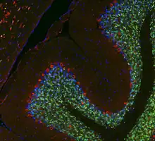 NeuN antibodies are widely used to label neurons, despite some shortcomings, and a January 2023 Pubmed search using the keyword "NeuN" produced 4200 hits.[4] A few neuronal cell types are not recognized by NeuN antibodies, such as Purkinje cells, stellate and Golgi cells of the cerebellum, olfactory Mitral cells, retinal photoreceptors and spinal cord gamma motor neurons. However the vast majority of neurons are strongly NeuN positive, and NeuN immunoreactivity has been widely used to identify neurons in tissue culture and in sections and to measure the neuron/glia ratio in brain regions.[5] NeuN immunoreactivity becomes obvious as neurons mature, typically after they have downregulated expression of Doublecortin, a marker seen in the earliest stages of neuronal development.