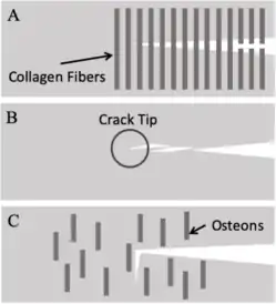 Extrinsic mechanisms contributing to fracture resistance in cortical bone by crack bridging and crack deflection. Adapted from Zimmermann et al.[6] displaying A crack bridging by collagen fibers, B crack bridging by uncracked ligaments, and C crack deflection by osteons.