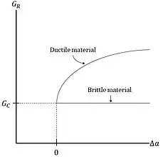Resistance curve of crack extension force versus crack extension for a brittle and ductile material, showing , the critical strain energy release rate.