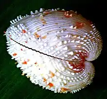 Fragum unedo is a species of cockle, a marine bivalve mollusc in the family Cardiidae, commonly known as the Pacific strawberry cockle. It is found in tropical seas in the Indo-Pacific region and the empty shells are prized for use in decorative crafts.[2]