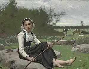 From 1875 until his death, he and his family were regular visitors at the artists' colony in Concarneau, where he had been invited to come by its founder Alfred Guillou and in whose home they sometimes stayed.[1] The soft light of the region inspired him to focus on painting children and young women, generally in peasant scenes. He would often sketch profusely during the summer, then finish the painting during the winter at his Paris studio. Most of his models came from the Concarneau region.[3]