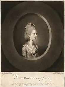 ![]() Frances Villiers, Countess of Jersey. A mezzotint engraving by Thomas Watson (1743–1781), published in 1774 after the original portrait by Daniel Gardner. | |