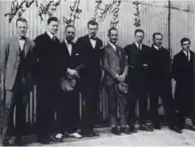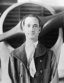 Wead received a permanent promotion to Lieutenant (junior grade) on 3 June 1919 (as of 1 January 1920, he remained in the temporary rank of Lieutenant).[13] In the late summer of 1919, Wead requested naval aviation flight training at Aeronautic Station Pensacola, Florida. His request was approved and he was assigned to Class 1 (the first class of regular officers sent to Pensacola after the commencement of World War I), on 15 September 1919. Wead reported to Pensacola and was billeted in a two-man room with Lieutenant (j.g.) Ralph Eugene Davison, a classmate at the Naval Academy. Wead was assigned to a training flight team with two other officers and former classmates, Lieutenants (j.g.) Robert Morse Farrar and Calvin Thornton Durgin. In addition to basic and advanced flight and navigation, the students were trained on a catapult installed on a barge at Pensacola. Wead was designated a United States Naval Aviator on 17 April 1920; his wife, Minnie "Min" Wead, pinned his golden wings to his uniform. On Saturday, 5 June 1920, Lieutenant Wead was appointed a naval aviator, along with Lieutenants Felix Stump, Robert Morse Farrar, Homer Webb Clark, Robert Walton Fleming, Stanton Hall Wooster, Ralph Eugene Davison, John Dale Price, Calin Thornton Durgin, and Henry James White.[14] Wead was promoted to Lieutenant on 1 July 1920.[15]