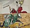 In each of the tournaments, the participants are shown engaging in a foot combat. A variety of weapons are used, including iron clubs (Eisenkolben), flails (Drischel), swords (Turnierschwert)[43] and daggers.[44] With one exception (folio 51), all the foot combat miniatures were painted by the same anonymous artist.[45]