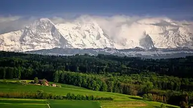 One of the most prominent Alpine ranges, the Bernese Alps extend from the gorge of Saint-Maurice, through which the Rhône finds its way to Lake Geneva, to the Grimsel Pass or, depending on the definition, to the river Reuss (thus including the Uri Alps). The principal ridge, a chain that runs 100 kilometres (62 mi) from west (Dent de Morcles) to east (Sidelhorn), whose highest peak is the Finsteraarhorn, forms the watershed between the cantons of Bern and Valais. Except for the westernmost part, it is also the watershed between the Rhine (North Sea) and the Rhône (Mediterranean Sea). This chain is not centered inside the range but lies close (10 to 15 km) to the Rhône on the south. This makes a large difference between the south, where the lateral short valleys descend abruptly into the deep trench forming the valley of the Rhône and the north, where the Bernese Alps extends through a great part of the canton of Bern (Bernese Oberland), throwing out branches to the west into the adjoining cantons of Vaud and Fribourg. There the mountains progressively become lower and disappear into the hilly Swiss Plateau.[2] The Bernese Alps have a large influence on the climate of Switzerland: while their north side is very exposed to weather, their south side is protected from it. As a consequence, agriculture consists essentially of dairy farming and cattle breeding on the northern foothills, while on the sunnier southern foothills (Rhone Valley) it also consists of vineyards.