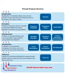 Friends-International runs a social services program supporting the development of children, youth, their families and communities that impacts over 30,000 beneficiaries a year in Cambodia, Thailand, Laos and Indonesia.[5] The Friends program is defined by a range of services that respond to the many challenges that marginalized young people face, namely abuse, sickness, drug use, exclusion from educational and training opportunities, child labor, poverty and separation from family. The program consists of a continuum of care in which beneficiaries build gradually to the result of reintegration. Program services are facilitated through a comprehensive case management system (individualized support to each beneficiary by an assigned case manager) and ongoing access to basic services (health checkups, non-formal education, awareness building, counseling).