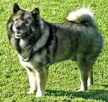 The fu quan is spitz tugou with a compact, square-shaped body, broad head, pricked ears, deep chest, muscular loin, and a tail that is carried over their back.[5] This dog has a thick, rough coat that comes in a variety of colors, such as silver, blue, black, brown, or red.[6]
