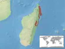 Furcifer bifidus is found in east Madagascar, and there is no known type locality.[2] According to the International Union for Conservation of Nature (IUCN), it can be found over an area of 35,368 square kilometres (13,656 square miles), and is therefore ranked as a Least Concern species of animal, although it is exposed to many threats.[1] It can be found on the east of Madagascar north after the Mangoro River, and as far as Daraina and Marojejy National Park (Marojejy Massif). It has been found at a highest of 700 metres (2,300 feet) above sea level.[1] The two major threats to the Furcifer bifidus are logging for commercial reasons and the slash-and-burn method in agriculture. The species has been listed as protected.[1]