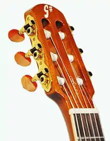The classical G# has the same body shape and size as the standard, but a wider neck, nylon strings, and also a slotted headstock like most classical guitars.[4]