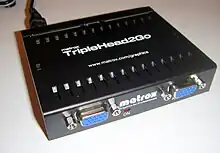 It is similar to TripleHead2Go, except it supports only 2 displays. When setting output to 1024x768 per display, the refresh rate can be set up to 85 Hz. It has maximum resolution of 2560×1024@60 Hz (1280×1024 each). It was later renamed to DualHead2Go Analog Edition.