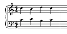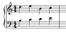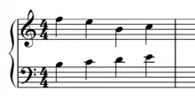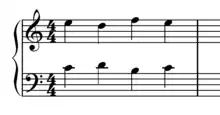 The Fenaroli features four events, with the melody featuring a descent from scale degree 4 to scale degree 3 followed by an ascent from scale degree 7 to scale degree 1.[1] The Fenaroli bass features a stepwise ascent from scale degrees 7 to 3. Another common Fenaroli melody is scale degree 2 to scale degree 3, then scale degree 7 to scale degree 1, which creates a canon with the bass.[17] A countermelody exists for the Fenaroli, as taught by Francesco Durante.[18]