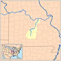 The headwaters of the Gasconade are in the southeastern corner of Webster County northeast of Seymour, Missouri where it drains the eastern margin of the Springfield Plateau at approximately 37°11′54″N 92°41′44″W / 37.19833°N 92.69556°W / 37.19833; -92.69556.[9] The river joins the Missouri River at the city of Gasconade at 38°40′28″N 91°32′55″W / 38.67444°N 91.54861°W / 38.67444; -91.54861.[10] The river follows a meandering course through the Ordovician age dolomite and sandstone bedrock of the Ozark Salem Plateau creating spectacular bluffs and incised meanders along the way.[11] Numerous springs and caves occur within the drainage area and along the river course. Significant tributaries include the Osage Fork of Webster and Laclede counties and Roubidoux Creek and Big Piney River of Texas and Pulaski counties. The Roubidoux and Big Piney flow respectively along the west and east boundaries of Fort Leonard Wood which lies a short distance south and east of the Gasconade.