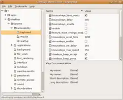 Gconf-editor gives users the ability to access settings stored in the XML-based GConf configuration database or registry. It is used primarily by developers to debug applications, or by power users to edit hidden and complex settings. It abstracts the values from the GConf database and presents them in an interface similar to Microsoft Windows' registry editor.