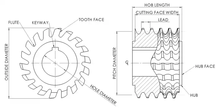 The hob is a cutting tool used to cut the teeth into the workpiece. It is cylindrical in shape with helical cutting teeth. These teeth have grooves that run the length of the hob, which aid in cutting and chip removal. There are also special hobs designed for special gears such as the spline and sprocket gears.[6]