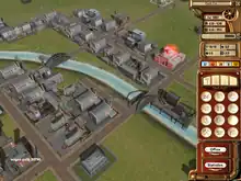 One of the earliest infrastructure upgrades is to supply buildings with water and fire coverage, increasing productivity and decreasing fire risk. This done through a pumping station placed at the edge of a body of water and water towers to transport it to distant areas, with fire stations placed within the water coverage. When electricity becomes available, the addition of that resource further increases productivity. Electricity is produced by a power plant and spread by transformer stations.[6]
