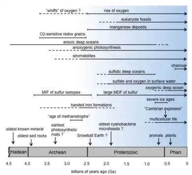 The geologic timescale overlain with major geobiologic events and occurrences. The oxygenation of the atmosphere is shown in blue starting 2.4 Ga, although the exact dating of the Great Oxygenation Event is debated.[14]