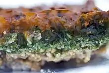 A vertical cross section of a microbial mat containing different organisms that perform different metabolisms. The green are presumably cyanobacteria, and teepee-like microstructures are visible on the surface.