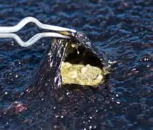 A microbial mat growing on acidic soil in Norris Geyser basin, Yellowstone National Park, USA. The black top serves as a sort of sunscreen, and when you look underneath you see the green cyanobacteria.