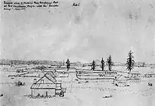 —Fort Vancouver and the Village from the Northwest, July, 1851, Drawn by George Gibbs. From collection of photographs entitled Drawings by George Gibbs in the Far Northwest, 1849–1851, in the American Bureau of Ethnology. Smithsonian Institution.