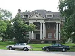 Renner arranged for the construction of the present house in 1907. Built of brick with a tiled roof,[1] it is typical of the homes of Youngstown's commercial élite at the beginning of the century. A grand two-story portico occupies most of the north-facing facade, contributing strongly to the house's Georgian Revival appearance.[2] Paired columns with Ionic capitals support the porch ceiling and the portion of the third story sitting above it, while the side rises to a pedimented third-story gable with a Palladian window. Small flights of steps provide access to the portico and to a smaller porch on the western side.[3]