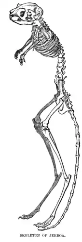 Like other bipedal animals, their foramen magnum—the hole at the base of the skull—is forward-shifted, which enhances two-legged locomotion.[4] The tail of a jerboa can be longer than its head and body, and a white cluster of hair is commonly seen at the end of the tail. Jerboas use their tails to balance when hopping, and as a prop when sitting upright. Jerboa fur is fine, and usually the colour of sand. This colour usually matches the jerboa habitat (an example of cryptic colouration).[1][2] Some species of the jerboa family have long ears like a rabbit, whilst others have ears that are short like those of a mouse or rat.