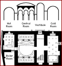 The baths consist of rooms similar to the Roman Hypocaust system of baths with a normal temperature room for undressing, a cold room and a hot room. Channels under the floor would allow warm air to circulate as a form of underfloor heating. This process of bathing would act like modern saunas whereby moving between hot and cold temperatures cleanses the body by sweating.[7]