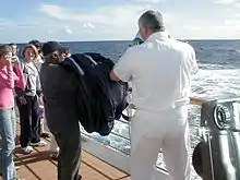 SVP project drifter deployments began in 1979; the design continued to develop until reaching its current form in 1992.[5] Each drifter consists of a spherical surface buoy tethered to a weighted nylon drogue that allows it to track the horizontal motion of water at a depth of 15 meters.[6] If the drogue breaks off, the wind pushes the surface buoy through the water, creating erroneous current observations.[6] A tether strain gauge has been added to monitor tension of the buoy-drogue connection to resolve this issue.[6] The original drifters are heavy, bulky (40 cm diameter), and expensive relative to the newer "mini" drifters that are smaller, (30.5 cm diameter) cheaper, and lighter because the hull contains fewer batteries.[5] The surface float contains alkaline batteries, a satellite transmitter, a thermistor for sub-skin sea surface temperature, and sometimes other instruments that measure pressure, wind speed and direction, or salinity.[5]