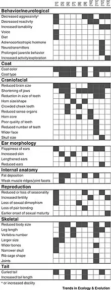 - ↑ Wright, Dominic; Henriksen, Rie; Johnsson, Martin (December 2020). "Defining the Domestication Syndrome: Comment on Lord et al. 2020". Trends in Ecology & Evolution. 35 (12): 1059–1060. doi:10.1016/j.tree.2020.08.009. PMID 32917395. S2CID 221636622.