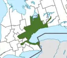 GO Transit primarily serves the Greater Toronto and Hamilton Area–the cities of Toronto and Hamilton and the surrounding regions of Halton, Peel, York and Durham. GO Transit's lines extend into the nearby Niagara and Waterloo Regions, the cities of Brantford and Peterborough, and Simcoe, Dufferin and Wellington counties[1]—an area largely coextensive with the Greater Golden Horseshoe. Under the provincial charter, GO Transit is permitted to serve cities elsewhere in Ontario, but has no plans of doing so.