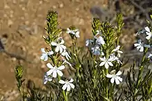• Goodenia scapigera subsp. graniticola L.W.Sage[8] differs from the autonym in having leaves that are in clusters, linear, not toothed, and up to 2 mm (0.079 in) wide;[7][9]