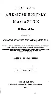 Graham's Magazine was a nineteenth-century periodical based in Philadelphia established by George Rex Graham and published from 1840 to 1858. It was alternatively referred to as Graham's Lady's and Gentleman's Magazine (1841–1842, and July 1843 – June 1844), Graham's Magazine of Literature and Art (January 1844 – June 1844), Graham's American Monthly Magazine of Literature and Art (July 1848 – June 1856), and Graham's Illustrated Magazine of Literature, Romance, Art, and Fashion (July 1856 – 1858).[1]