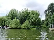The island is more of a lozenge than ellipse. At its greatest extent it is 35m long and 15m wide. Within the low lying, tree-covered, somewhat tenuous land of the island are six weekend chalets of garden summerhouse size with mooring spaces. It is linked to the northern bank, the residential far south-east of Sunbury, by a footbridge.[1]