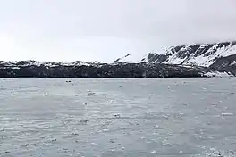 In 2004 Grand Pacific Glacier was about 2 miles (3,200 m) wide at the terminus, averaging about 150 feet (50 m) high at the ice face, up to 60 feet (20 m) deep at the waterline and over 35 miles (56 km) long. Much of the ice margin was then grounded at low tide; the calving section probably reached a water depth of only 30–60 feet (10–20 m). The ice cliff was estimated to be 60 feet (20 m) high where it was grounded, but about 150 feet (50 m) and up to 180 feet (55 m) high where it calved into Tarr Inlet. Behind the terminus, the ice may thicken to 900 feet (300 m) or more. The western two thirds of the ice in the terminus of the Grand Pacific Glacier originate from the tributary Ferris Glacier, and flowed about 1,500 feet (500 m) per year or about 4 feet (1 m) per day. This latter estimate was based on measurements of aerial photographs taken between 1988 and 1990 and may be higher than 2004 rates based on the fact that the ice had been thinning over the last 7 years or so. The eastern portion of Grand Pacific Glacier moved only about 150–180 feet (46–55 m) per year based on GPS measurements made by the Cold Regions Research and Engineering Laboratory (CRREL) in 1998–1999. It had advanced at a rate of about 60 feet (20 m) per year for the last several decades, but it reached a maximum position when it joined Margerie Glacier around 1992. In 2004 those glaciers were no longer together due to recession of the Grand Pacific margin. A small stream flowed between the two termini. The eastern edge was then receding at about 30–60 feet (10–20 m) per year and showed significant thinning and closure of crevasses. In about 1996, an embayment began to form in the center of Grand Pacific's terminus. Since then, the center of the ice cliff began to calve more rapidly and was slowly receding at perhaps 30 feet (10 m) or less per year. In 2004 the CRREL anticipated that retreat would accelerate as the embayment enlarged and the depth at the waterline increased. In such a scenario, retreat was likely to continue until the terminus reaches a position where it will become grounded above mean tide. The grounded western edge of the glacier was also slowing receding and thinning. Rock debris from landslides and medial moraines cover much of this side of the glacier and extends across almost two-thirds of the ice face. Where this rock debris is more than an inch thick, it insulates the ice, slows melting and results in a thicker ice mass than where the ice is clean. In many areas on the glacier, the debris is more than 3 feet (1 m) thick.[2]