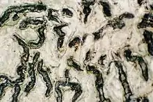 Graphis scripta is a crustose lichen in the family Graphidaceae. It is commonly called script lichen, secret writing lichen, or similar names, because its growth pattern makes it looks like writing.[1][2] Stigmidium microspilum and Arthonia graphidicola are associated lichenicolous fungi.[2] It is variable with either curved or stellate apothecia. The margins are carbonaceous and raised, without furrows. Mature spores are without color, but become brown with age.[2]
