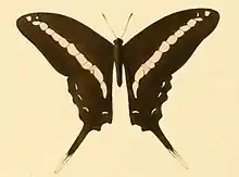 The hindwing is tailed as in Graphium policenes an it also agrees in the other distinguishing marks so nearly with policenes that it can scarcely be distinguished from it except by the unicolorous black middle cell of the forewing and the absence of the submarginal spots of the same wing. The markings of the upper surface consist only of a narrow median band, which, however, is continuous from the costal margin of the forewing to the middle of the inner margin of the hindwing and composed of 8 to 9 spots on the forewing (in cellules 1 a to 6 or 7 and 8) and 4 spots on the hindwing (in cellules 1 c, 6, 7 and the middle cell), and of 4 to 6 submarginal spots on the hindwing. The hindwing above without red spots. The ornamental band of the hindwing beneath is well developed and consists of red, black-bordered bars in cellules 1 c, 2, 3, 7 and in the apex of the middle cell.[4]