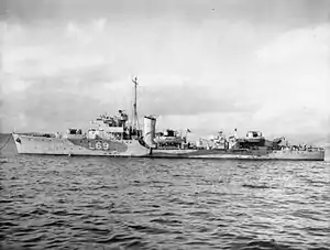 HMS Tanatside was a Hunt-class destroyer of the Royal Navy. She was launched at Yarrow in April 1942. Ships of this class were designed as cheap, easily built vessels for convoy escort and antisubmarine duties. She was named like her sisters after a fox hunt, in her case one in North Wales. War bonds were issued to finance the building of warships. Tanatside was funded by people from Tregaron, Aberaeron, New Quay, Aberystwyth and Teifiside, in a nod to the ship's name. Plaques were presented to each of these townships.[1] During a Warship Week held between 14 and 21 March 1942 the civil community of the Welsh county of Cardiganshire adopted the ship.