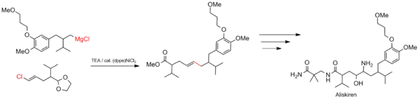 The Kumada coupling is suitable for large-scale, industrial processes, such as drug synthesis. The reaction is used to construct the carbon skeleton of aliskiren (trade name Tekturna), a treatment for hypertension.[22]