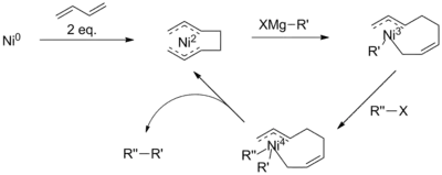 Though poorly understood, the mechanism of this reaction is proposed to involve the formation of an octadienyl nickel complex. This catalyst is proposed to undergo transmetalation with a Grignard reagent first, prior to the reductive elimination of the halide, reducing the risk of β-hydride elimination. However, the presence of a Ni(IV) intermediate is contrary to mechanisms proposed for aryl or vinyl halide couplings.[11]