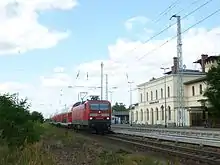Großenhain Berliner Bahnhof[3] is a railway station in the municipality of Großenhain, Saxony, Germany. It lies on the Dresden-Friedrichstadt-Elsterwerda railway line and the connecting line to Großenhain Cottb Bf, which branches off here. Since 2002 the scheduled rail traffic at the railway station has been discontinued in favour of Großenhain Cottbuser Bahnhof, which is located closer to the city.
