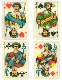 Grobhäusern is mentioned as early as 1749 as a "pleasant German game" alongside Rummel, Scherwentzeln and Contra.[5] But it was often viewed as a gambling game and consequently banned as, for example, in 1771 in a Duchy of Anhalt ordinance.[6] Grobhäusern and Trischak are described as "similar to", but nevertheless "different from" Scherwenzel by Adelung in 1780.[7] As of the late 18th century, Grobhäusern was played in rural Upper Saxony,[8] and Scherwenzel was played in rural areas of Germany, Poland, Silesia and Bohemia.[9] The use of Jacks (and to a lesser extent 9s) as wildcards in Scherwenzel may be related to the elevation of Jacks (and to a lesser extent 9s) to trumps in various European card games. Adelung suggested that Scherwenzel is the origin of the designation wenzel for Jacks as highest trumps.[10]