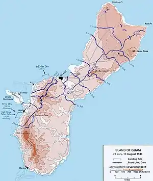 On 21 July 1944, United States Marine and Army forces invaded the island of Guam, the southernmost of the Mariana Islands chain in the Central Pacific, with the intent to take control of the island from the Imperial Japanese Army. Operation Forager II, as it was called by American planners, was a phase of the Pacific Theatre of World War II.